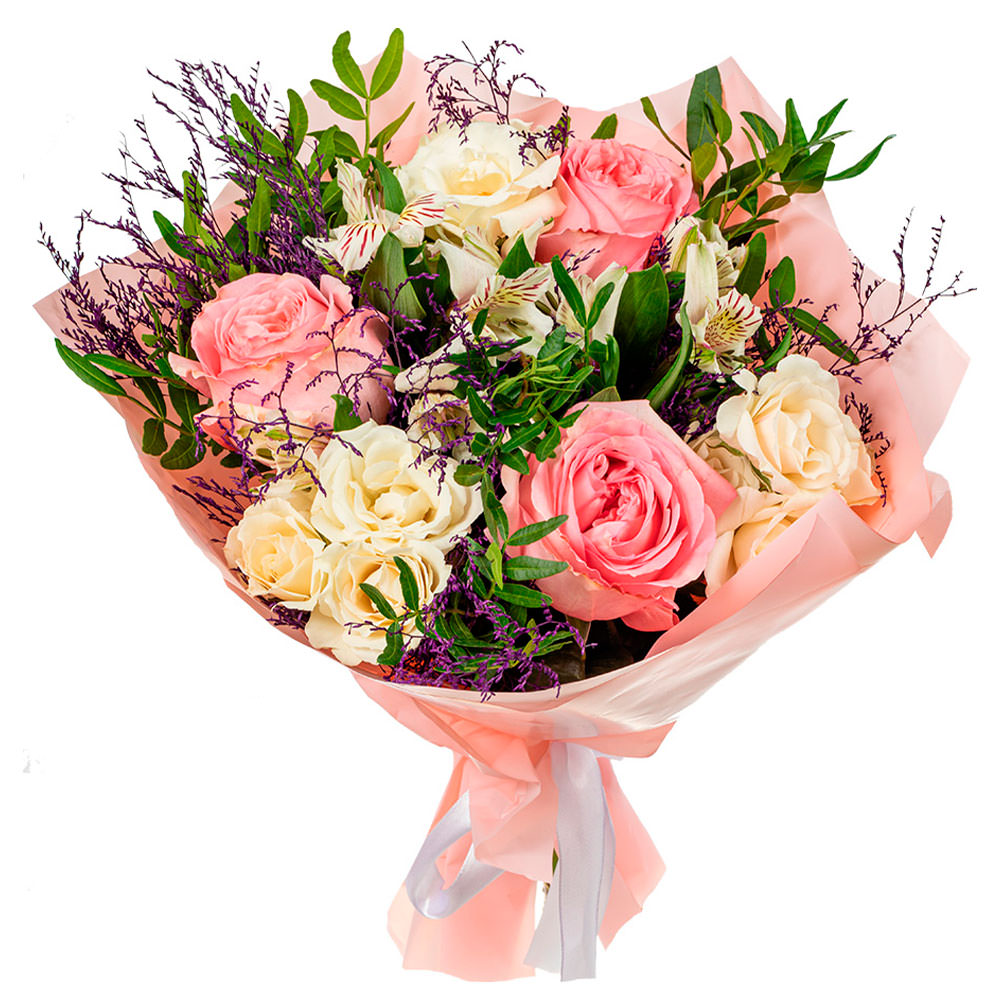 Роза одноголовая розовая, роза кустовая белая, альстромерия белая, лимониум, зелень. Упаковка (лента, пленка, крафт, сетка, пленка матовая)