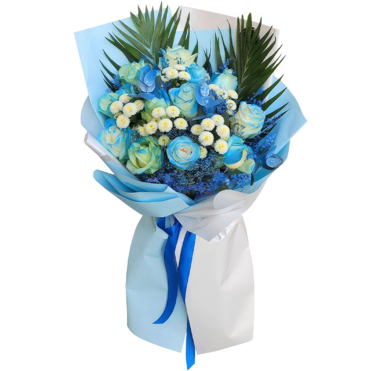 Роза одноголовая белая с голубым напылением, маргаритка мини белая, листья пальмы, эвкалипт. Упаковка (лента, пленка, крафт, сетка, пленка матовая)