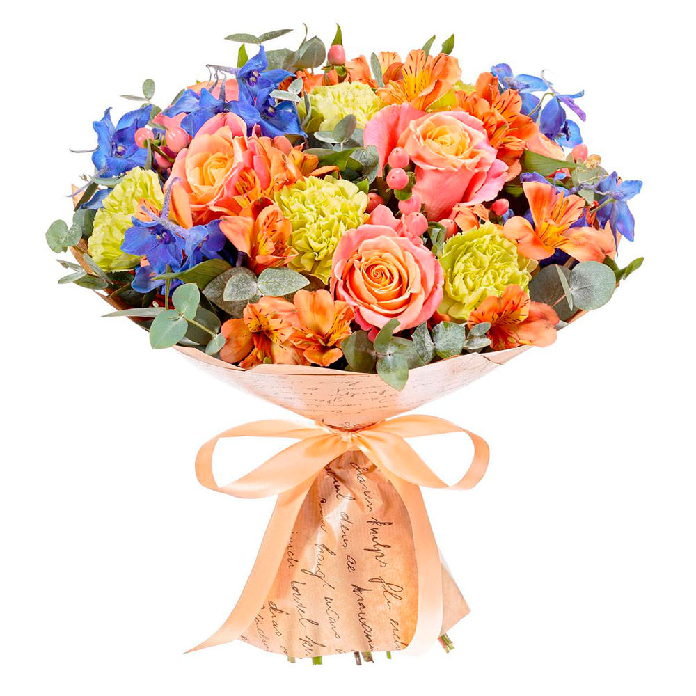 Роза одноголовая розовая, альстромерия оранжевая, эвкалипт, гвоздика желтая, колокольчик, гиперикум, эвкалипт. Упаковка (лента, пленка, крафт, сетка, пленка матовая)