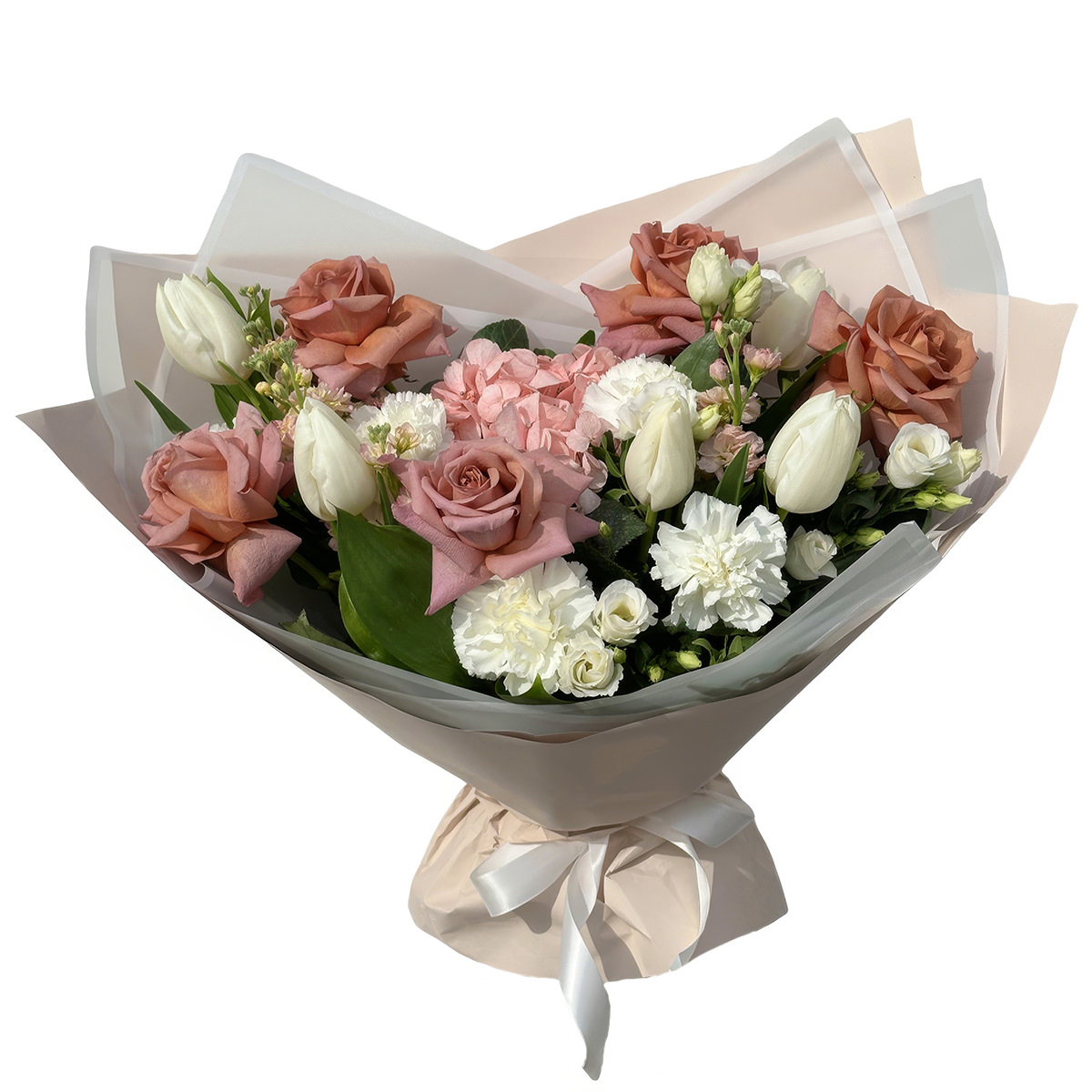 Роза одноголовая пудровая, тюльпан белый, гвоздика белая, эустома белая, гортензия розовая. Упаковка (лента, пленка, крафт, сетка, пленка матовая)