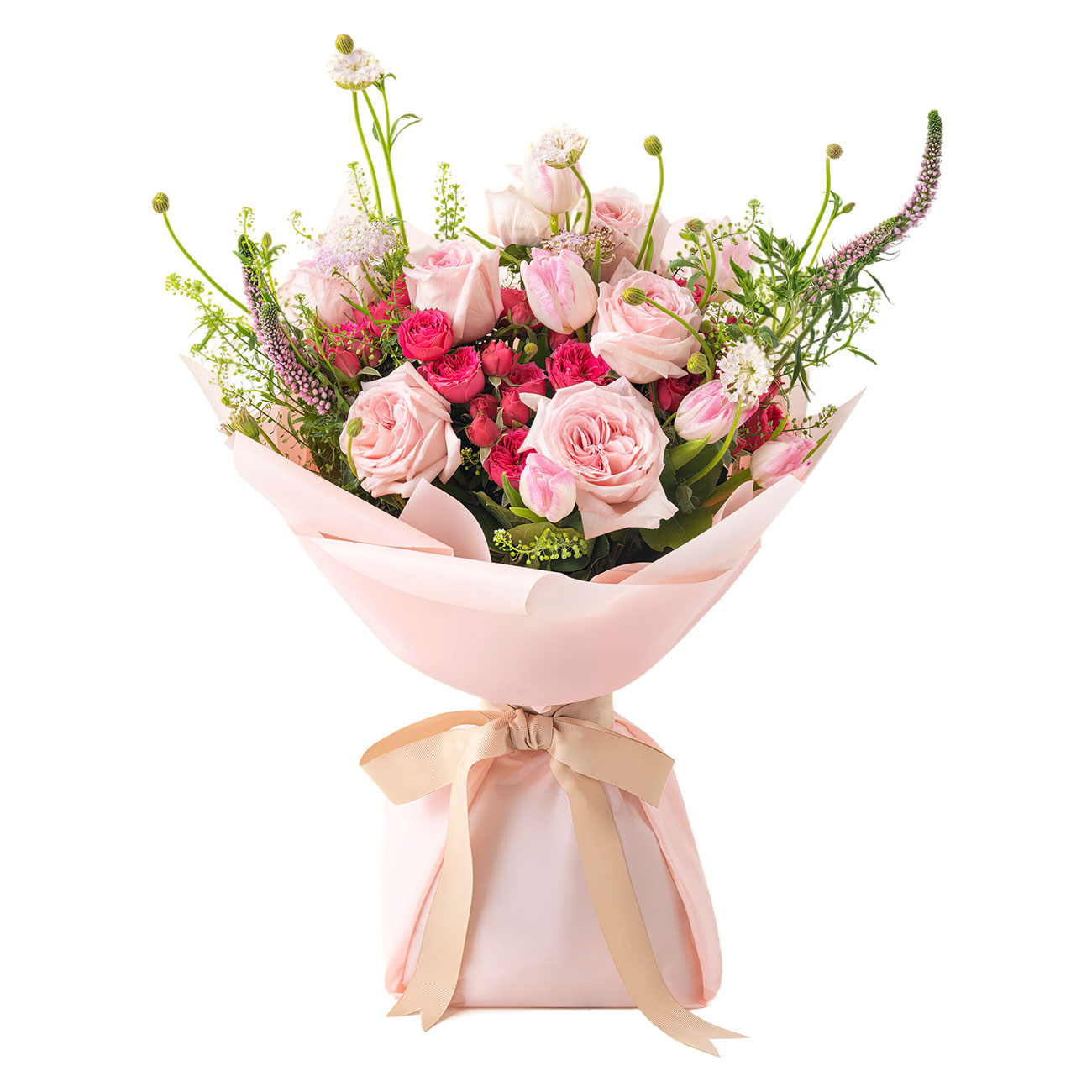 Роза пионовидная нежно-розовая, роза кустовая розовая кенийская, тюльпан розовый, шалфей, вероника, пеннисетум (фонтанный колос). Упаковка (лента, пленка, крафт, сетка, пленка матовая)