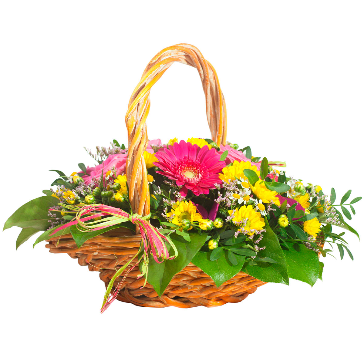 Гербера розовая, хризантема кустовая желтая, ромашка, лимониум. Упаковка (Корзина, оазис, ящик).