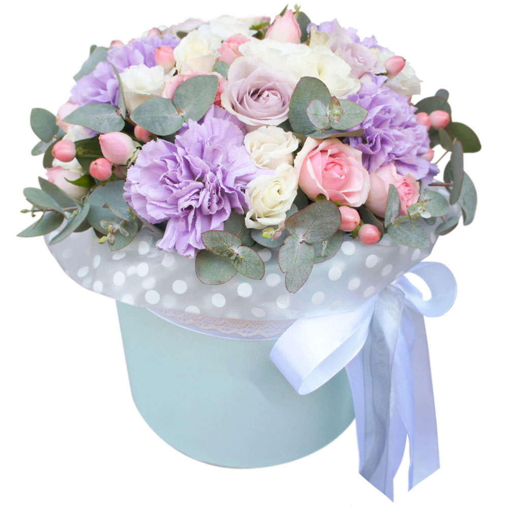 Гвоздика сиреневая, роза кустовая микс (белая, розовая), гиперикум, эвкалипт. Упаковка (шляпная коробка, квадратный бокс, коробка сердце, оазис)