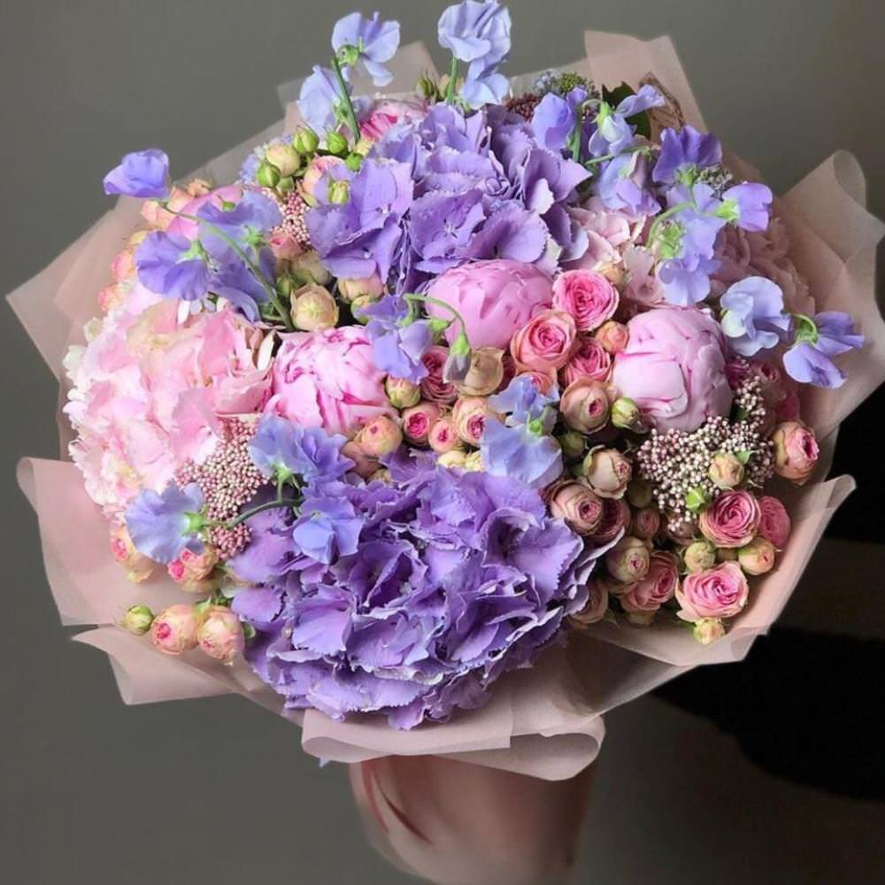 | Состав | Гвоздики, Пионовидные розы, Пионы, Розы, Розы свит аваланж |