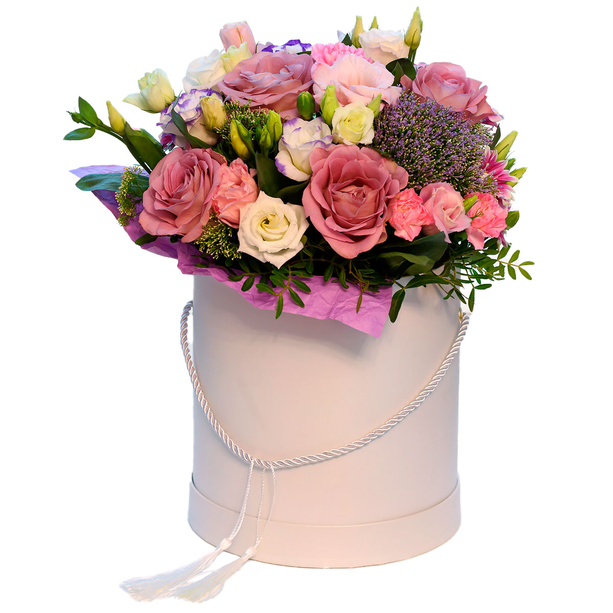 Роза одноголовая розовая, роза кустовая белая, эустома бело-фиолетовая, гвоздика кустовая мини розовая, зелень. Упаковка (шляпная коробка, квадратный бокс, коробка сердце, оазис)