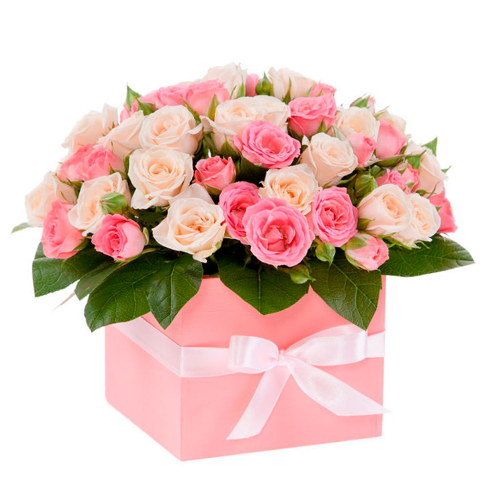 Роза кустовая микс (кремовая, розовая), зелень. Упаковка (шляпная коробка, квадратный бокс, коробка сердце, оазис)