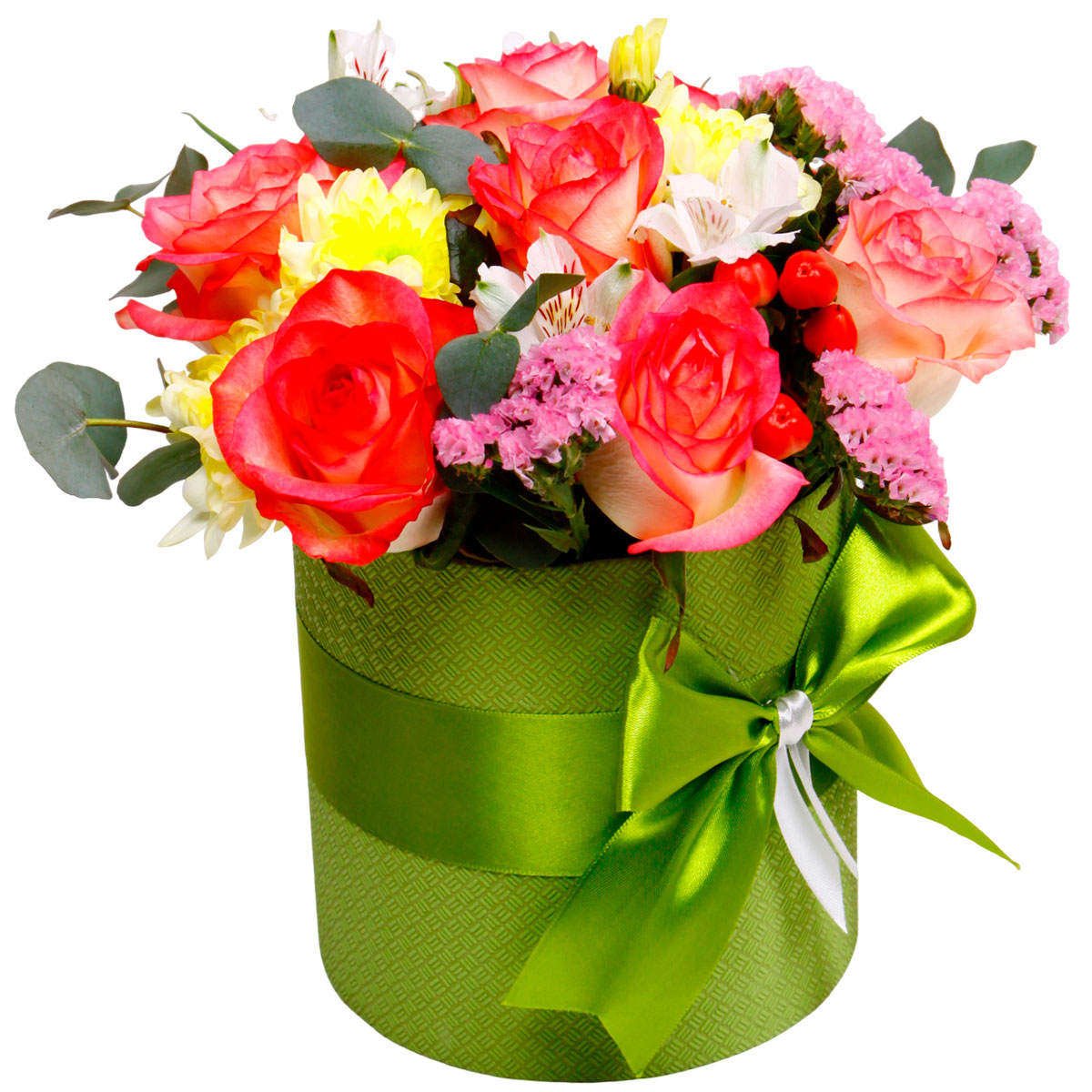 Роза одноголовая коралловая, хризантема кустовая желтая, альстромерия белая, статица розовая, эвкалипт. Упаковка (шляпная коробка, квадратный бокс, коробка сердце, оазис)