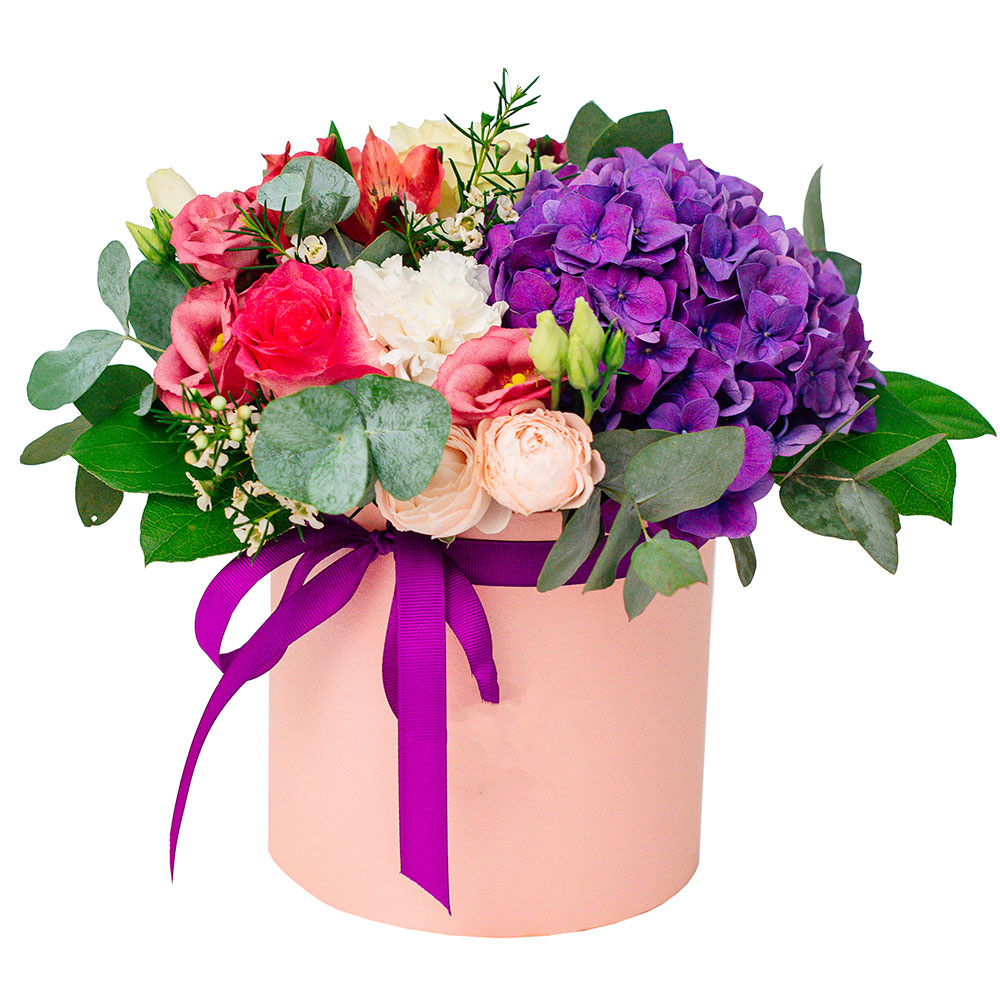Гортензия фиолетовая, роза кустовая пионовидная розовая, эустома розовая, роза одноголовая розовая, альстромерия красная, гвоздика белая, эвкалипт. Упаковка (шляпная коробка, квадратный бокс, коробка сердце, оазис)